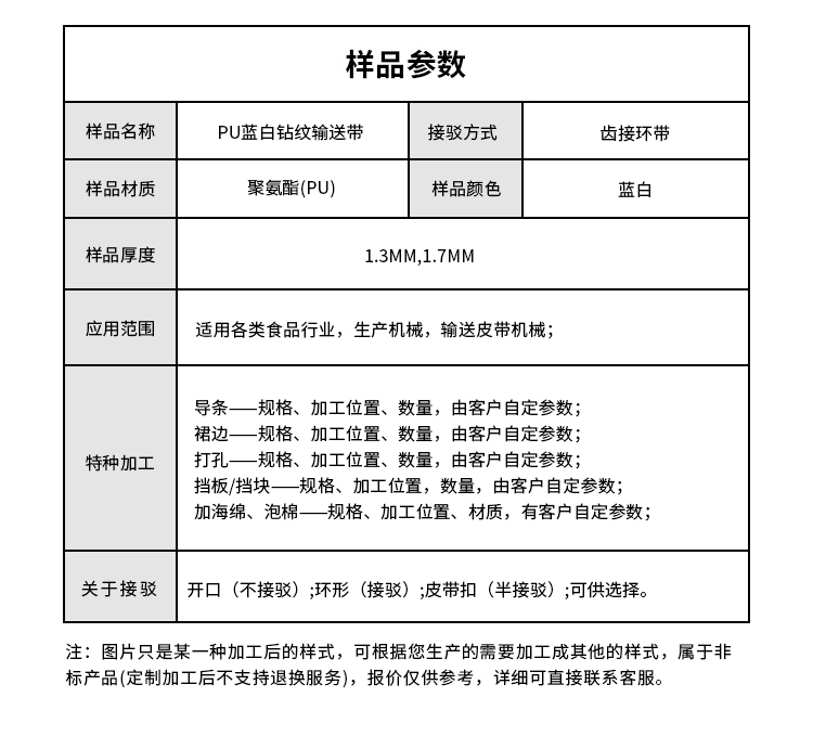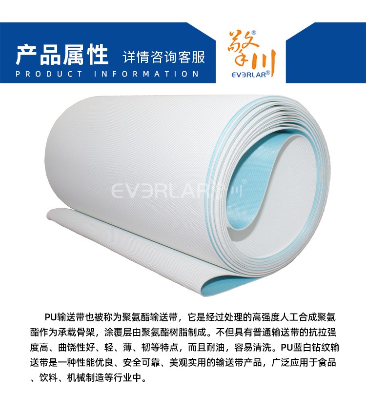 • 產(chǎn)品名稱:PU藍白鉆紋輸送帶耐磨耐油耐腐蝕工業(yè)皮帶定制